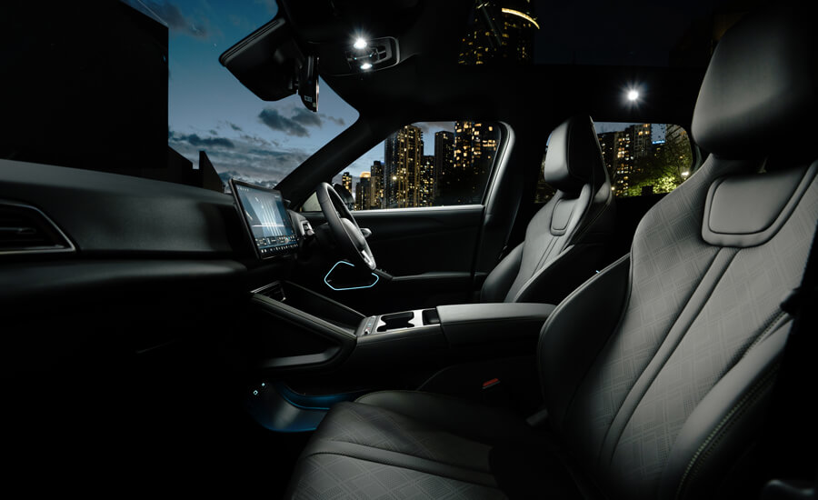 The BYD ATTO 2's interior is crafted with eco-friendly sleek vegan leather seats and high-quality materials throughout the dashboard and door panels.